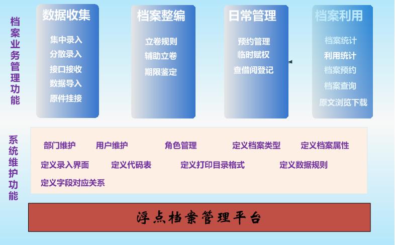 浮点综合档案管理系统是由北京浮点科技有限公司自主开发的档案电子化管理系统。提高了档案管理现代化程度的同时,也提高了档案资料的利用率。良好的档案管理不仅要对档案进行科学的维护,还要做到快速的查询检索、准确的统计等。浮点综合档案管理系统将档案管理工作与最新的计算机技术有机的结合起来,能极大程度的提高档案管理工作的质量和效率。