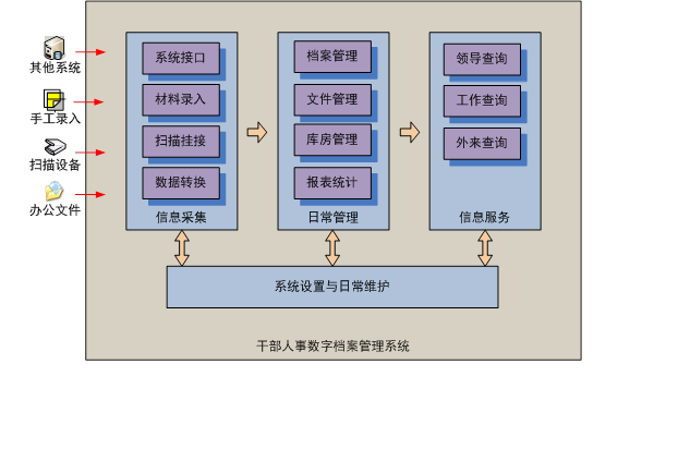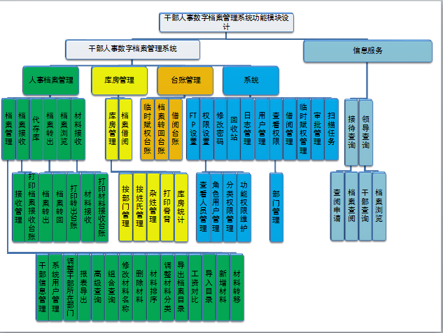 干部人事档案管理系统本着高起点和高标准的原则,依据中共中央组织部制定的《全国组织干部人事管理信息系统信息体系结构》规范和中央组织部、国家档案局颁发的《干部档案工作条例》进行规划和设计,完全符合国家相关标准。其主要功能是可以实现对干部档案及档案材料的收集、鉴别、整理、保管、转递、统计、查借阅等日常工作的计算机管理,并可通过组织部门内部局域网或专用网络安全地实现对干部人事数字档案的网上浏览和远程查借阅。